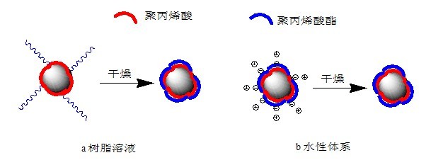 HT A20分子中的錨固部分由(甲基)丙烯酸、磷酸的均聚物或共聚物組成,通過和鈦白粉間的吸引力(配位作用、共價鍵)吸附在粒子表面,將粒子隔離開來。和樹脂相容的穩(wěn)定部分由丙烯酸酯、甲氧基聚丙二醇丙烯酸酯無規(guī)共聚物組成,賦予表面改性后的鈦白粉粒子良好的再分散性,并且能穩(wěn)定均勻分散在樹脂溶液和溶劑揮發(fā)后的樹脂中。在體系干燥過程中以及干燥后,和樹脂相容的部分能包覆在鈦白粉粒子表面,防止粒子聚集,使得鈦白粉粒子在樹脂中能均勻分散。圖2表示改性劑HT A20處理鈦白粉粒子后,HT A20在粒子表面的形態(tài)。圖2a表示在樹脂溶液或溶劑中,干燥前,改性劑的錨固部分和鈦白粉粒子間通過共價鍵、配位鍵結合在粒子表面上,聚丙烯酸酯部分充分伸展,通過空間位阻作用穩(wěn)定粒子;干燥后,聚丙烯酸酯部分包覆在粒子上或和樹脂基體互相滲透。圖2b表示在水性體系中,干燥前,改性劑的聚丙烯酸錨固部分和鈦白粉粒子間通過共價鍵、配位鍵結合在粒子表面上,依靠靜電斥力穩(wěn)定粒子;干燥后,聚丙烯酸酯部分包覆在粒子上或和樹脂互相滲透??梢姡p親型嵌段聚合物改性劑HT A20對鈦白粉進行有機表面處理后,在有機溶劑體系和水性體系中,都能提高鈦白粉在介質中的分散穩(wěn)定性并改善鈦白粉和樹脂的相容性。